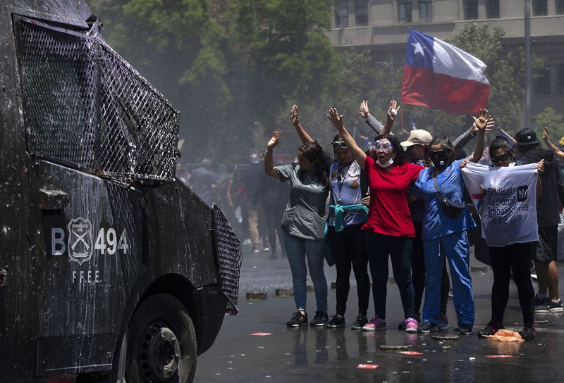Những người biểu tình chặn xe cảnh sát để phản đối chính phủ ở Chile ngày 26/11. |