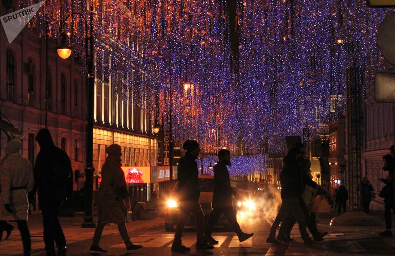 Tháng 12, tháng của lễ hội đã bắt đầu. Trên ảnh là phố Bolshaya Dmitrovka, Moscow, Nga được trang hoàng với các chùm đèn lấp lánh chào đón lễ giáng sinh sắp tới. |