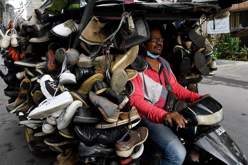 Người đàn ông vận chuyển giày đã qua sử dụng đi bán ở Campuchia. |