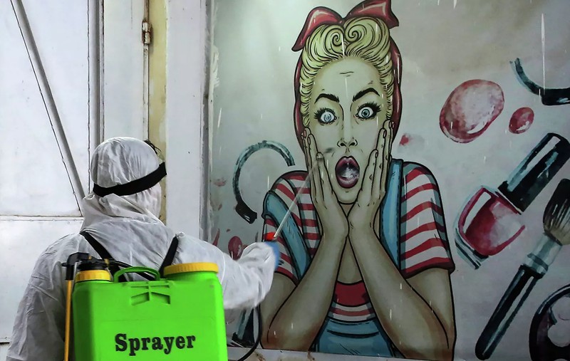 Nhân viên y tế phun thuốc khử trùng ở Baghdad. |