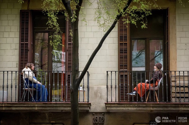 Hai phụ nữ nói chuyện từ ban công nhà mình ở Barcelona, Tây Ban Nha. |