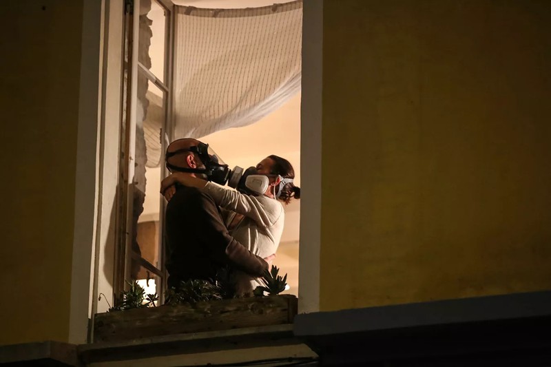 Cặp đôi yêu nhau đeo mặt nạ phòng độc bên cửa sổ ở Nice, Pháp. |
