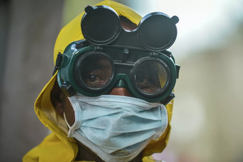 Công nhân đeo mặt nạ trong quá trình khử trùng tàu điện ngầm ở Addis Ababa, Ethiopia. |