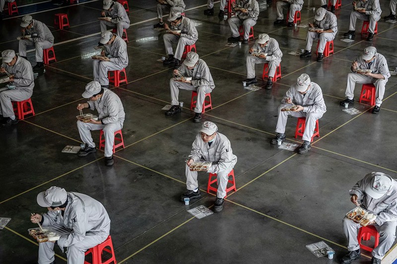 Giờ nghỉ trưa tại một nhà máy xe hơi ở Vũ Hán, Trung Quốc. |