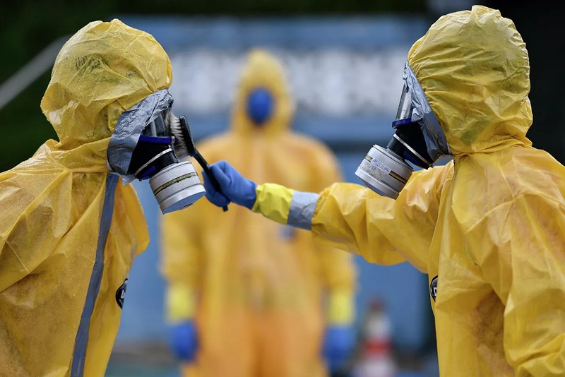 Lính cứu hỏa trong bộ đồ bảo hộ được huấn luyện đặc biệt liên quan đến đại dịch Covid-19 ở Brazil. |
