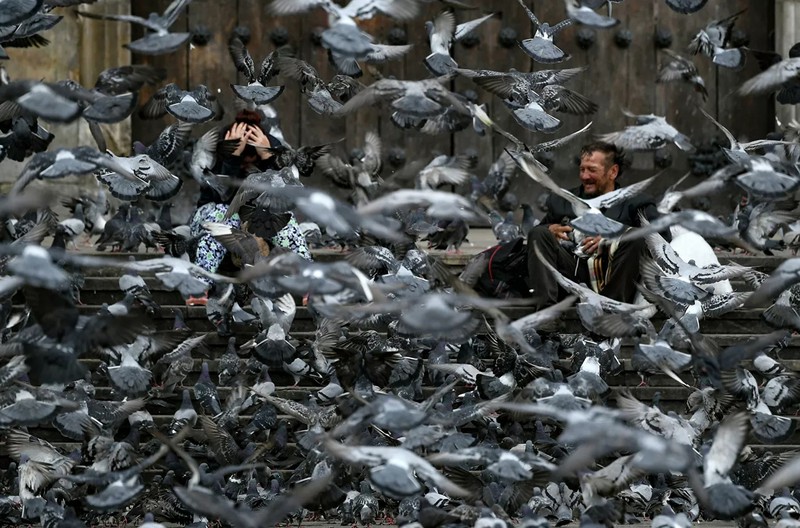 Đàn chim bồ câu tìm kiếm thức ăn trên đường phố ở Bogota. |