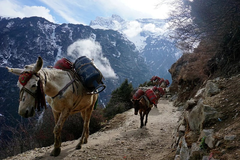 Những con la mang bình khí ga rỗng dọc theo một con đường mòn trong khu vực Everest. |