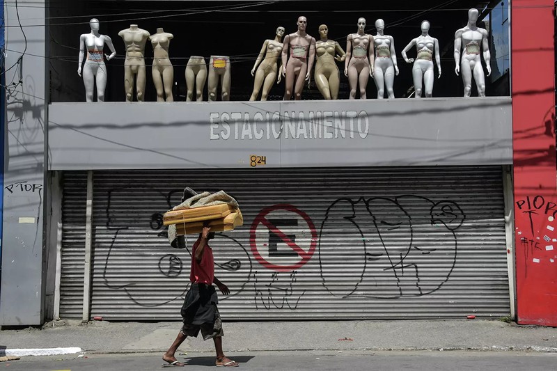 Người vô gia cư đi ngang qua cửa hàng đóng cửa ở trung tâm thành phố Sao Paulo, Brazil. |
