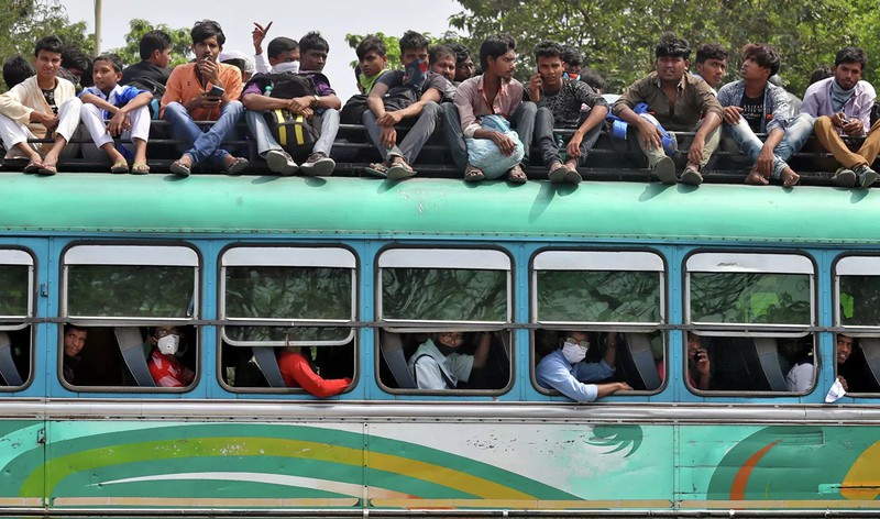 Người dân trên một chiếc xe buýt trên đường về nhà do lệnh cách ly tại Calcutta, Ấn Độ. |