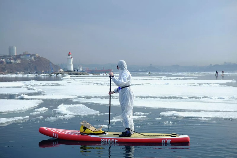 Vận động viên chèo thuyền trong bộ đồ bảo hộ ở vịnh Vladivostok, Nga. |