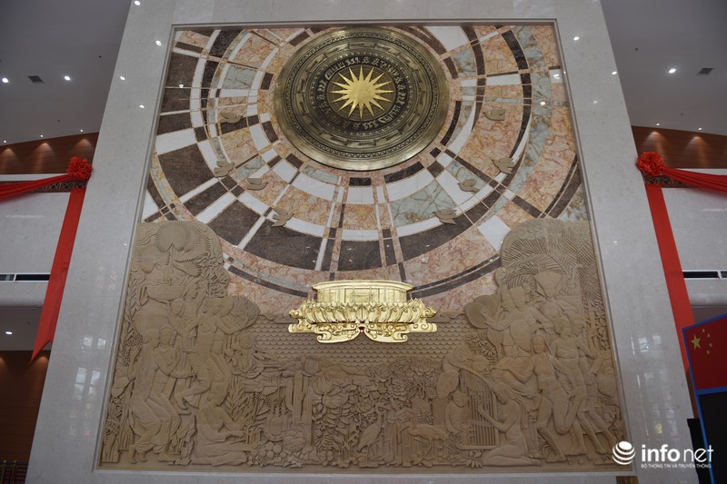 Phía đại đường của Cung đặt bức "Non nước nối liền hữu nghị muôn đời" do hai nước phối hợp thiết kế. Trên bích họa là tạo hình trống đồng với biểu tượng mặt trời tượng trưng cho ánh sáng và sức sống. Ngay bên dưới là bức phù điêu phong cách tự nhiên, dung dị thể hiện hình ảnh ca hát, nhảy múa của đồng bào dân tộc hai nước. |