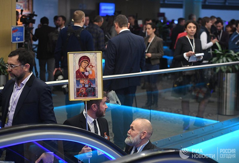 Các phóng viên từ tờ báo có tên "Vì chủ quyền của Nga" đã đến một cuộc họp báo với biểu tượng của Đức mẹ Maria. |