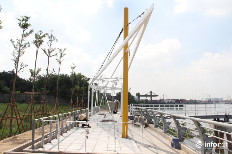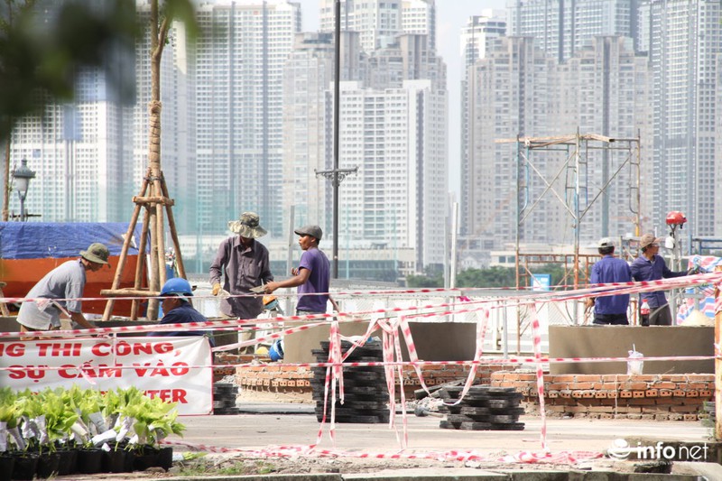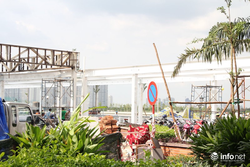 Tại bến Bạch Đằng, một phần của công viên được nhường chỗ để làm hệ thống nhà chờ, khuôn viên bến và phao nổi đón trả khách |