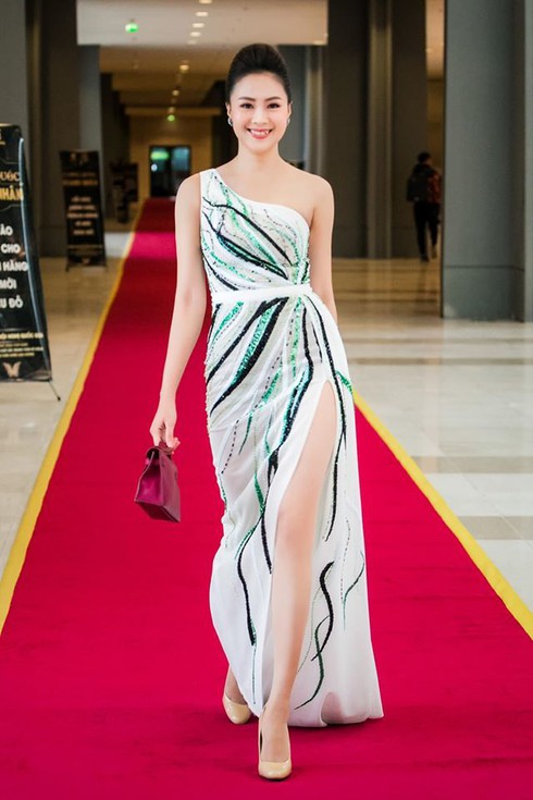 Khác với hình ảnh kín đáo trên phim, Hồng Diễm luôn chọn những chiếc đầm nữ tính sexy khi dự sự kiện. |