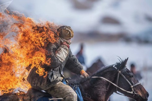 Diễn viên biểu diễn trong khuôn khổ giải vô địch cưỡi ngựa truyền thống Kok-Boru ở Kyrgyzstan. |