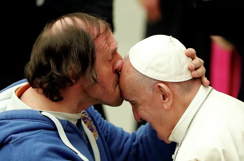 Một người đàn ông hôn Đức Giáo hoàng Phanxicô tại Vatican. |