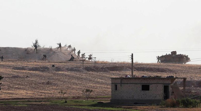 Những tay súng nổi dậy Syria do Thổ Nhĩ Kỳ hậu thuẫn đang tấn công làng Yabisa ở biên giới Thổ Nhĩ Kỳ - Syria hôm 13/10, |