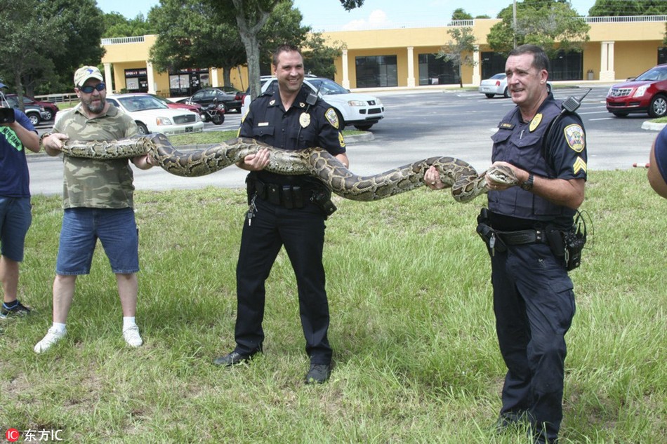 Tại Florida, Mỹ, cảnh sát giúp bắt giữ một con trăn Miến Điện khổng lồ dài tới gần 4m.