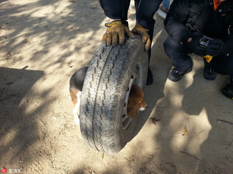 Một chú chó cưng mắc kẹt trong lốp xe, không thể ra, cảnh sát cũng lại là người xử lý.