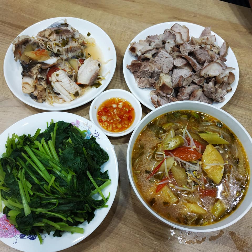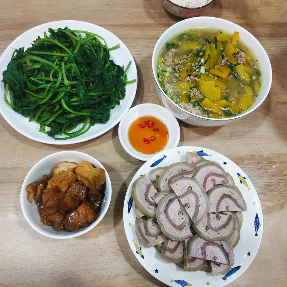 "Các món ăn nhà mình cũng chỉ có 3 món quay vòng tròn là rau, canh và một món mặn. Thỉnh thoảng cuối tuần thì nấu bún đổi vị thôi. Mình làm hành chính nghỉ cuối tuần nên thứ 7 và chủ nhật nhà mình sẽ ăn bún hoặc cháo. Đổi bữa mà dễ ăn nữa. Hai vợ chồng ai đi làm về trước thì đi chợ nấu cơm. Để bớt ngán mình cũng hay đổi bữa. Nhưng chủ yếu nhà mình toàn ăn rau là chính chứ thịt cá cũng ít nên dễ nấu lắm", Lâm Hương cho biết.