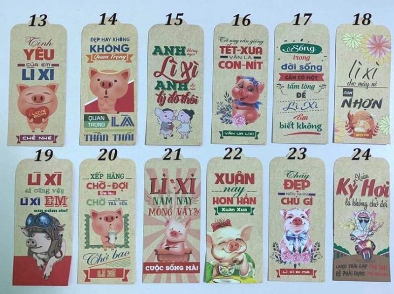 Đại diện một cơ sở sản xuất phong bao lì xì tại Hà Nội cho biết, năm nay các mẫu bao lì xì truyền thống có giá hấp dẫn nhưng không còn là "độc tôn" như mọi năm. Thay vào đó, các mẫu có in hình cầu thủ Việt Nam dù mới chỉ xuất hiện sau khi đội Việt Nam chiến thắng chung kết AFF Cup, lại được đặt nhiều. Riêng với mẫu in hình con heo vẫn được nhiều nơi lấy số lượng lớn bởi đó là con giáp của năm 2019.
