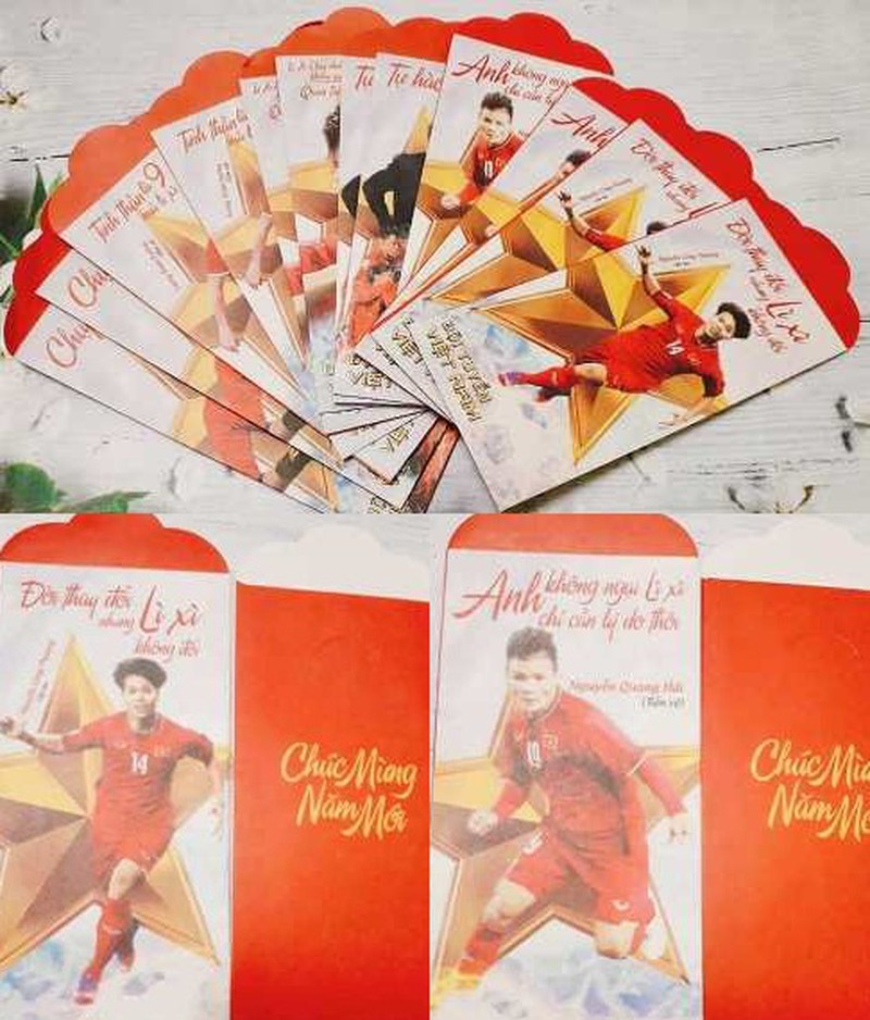 Bao lì xì in hình Huấn luyện viên Park Hang-seo cùng các cầu thủ Việt Nam được rao bán trên thị trường. |