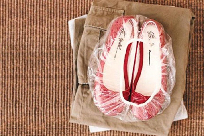 Khi đi du lịch, bạn thường nhét rất nhiều thứ vào trong vali. Cho giày vào vali có thể làm hỏng quần áo của bạn. Hãy đóng gói đôi giày của bạn trong chiếc mũ tắm để ngăn chặn đế giày chạm và quần áo sạch.