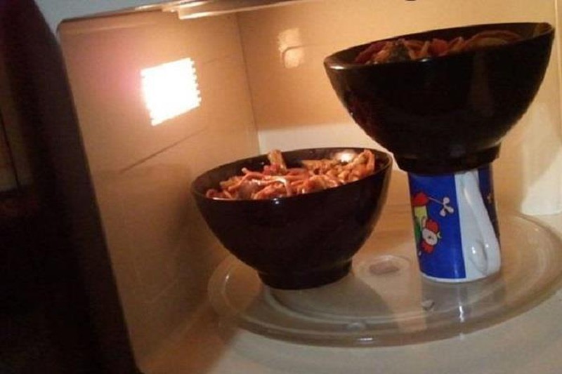 Khi bạn muốn hâm nóng cả hai tô thức ăn mà lò vi sóng quá nhỏ thì đây là một cách rất hữu hiệu nhé.