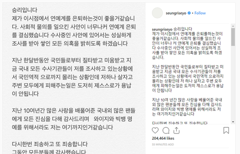 Hiện tại, Seungri vẫn đang phải tiếp nhận điều tra của cảnh sát về các nghi vấn phạm pháp. Hình ảnh mới nhất của Seungri là khi anh đến sở cảnh sát theo lệnh triệu tập điều tra. Seungri không còn dáng vẻ phong độ như lúc trước mà vô cùng tiều tụy, đồng thời tránh né ống kính truyền thông.