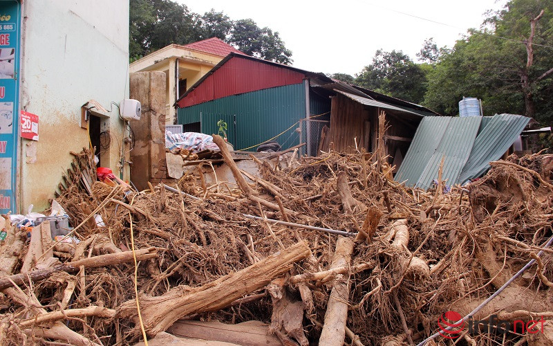 Nhà nằm ngay trên đường lũ dữ quét qua, toàn bộ tài sản của gia đình bà Hoàng Thị Minh (SN 1969, trú khối 1, thị trấn Mường Xén, huyện Kỳ Sơn) đã bị cuốn trôi. Nhà cửa giờ vẫn đang ngập ngụa bùn đất, rễ cây và đất đá.