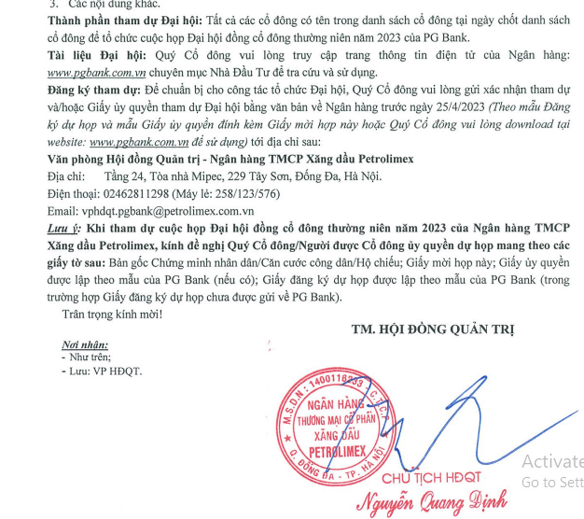 Ông Nguyễn Quang Định cũng khẳng định trong tài liệu trình đại hội đồng cổ đông thường niên năm 2023 không có thông tin và cũng không có chủ trương sáp nhập với một ngân hàng nào khác.