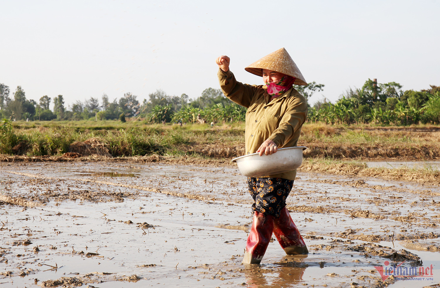 Mảnh ruộng vừa làm đất xong, chị Nguyễn Thị Nga (SN 1972, trú xã Nghi Vạn) đã đợi sẵn bên bờ, tranh thủ xuống giống, tránh để lâu ruộng bị khô nước.