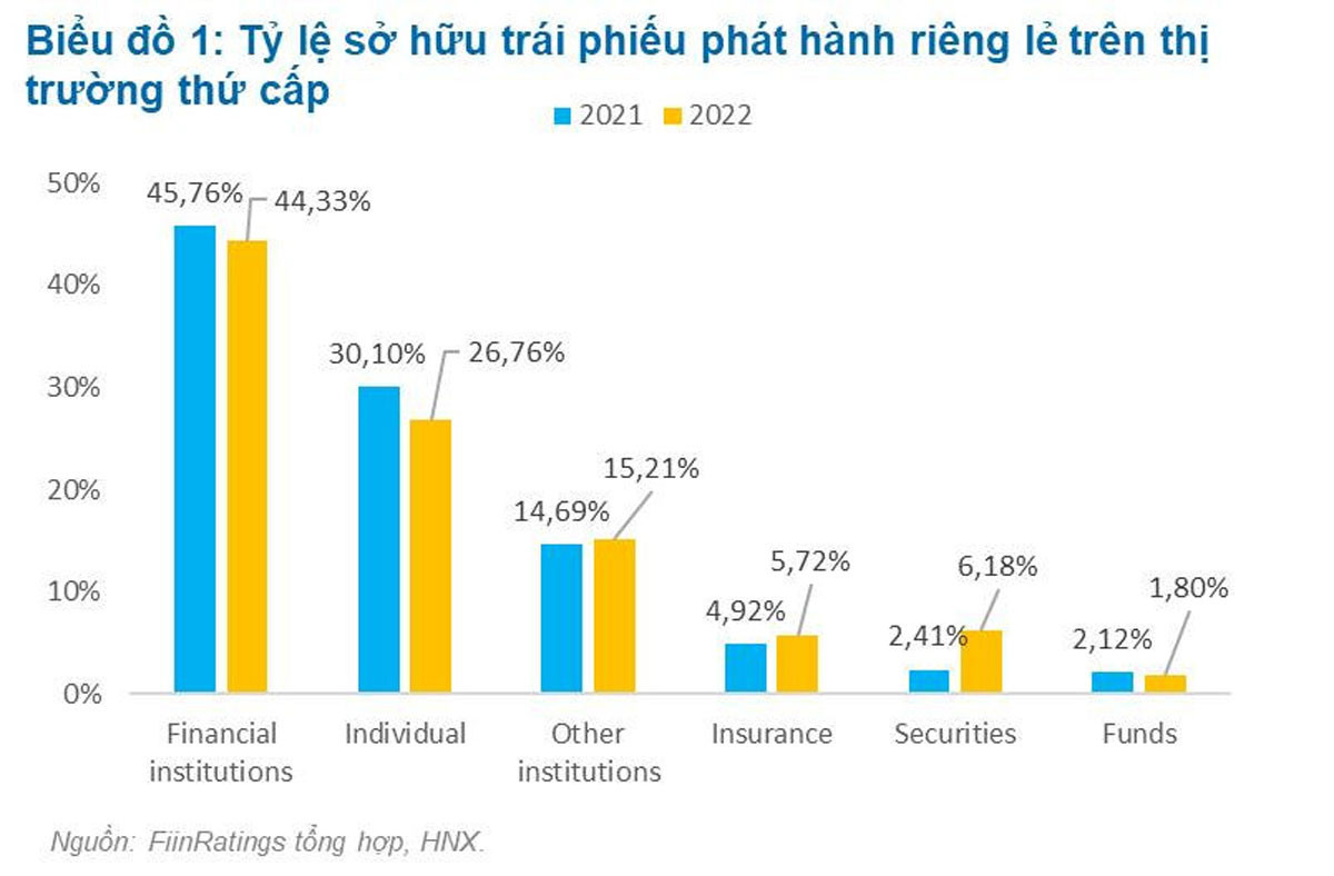 Theo FiinRatings, ngân hàng cùng với các công ty chứng khoán (financial institutions) đang nắm giữ trái phiếu lớn nhất với 44,33% trái phiếu riêng lẻ trên thị trường thứ cấp.