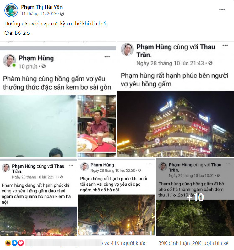 Cô nàng từng gây “bão” mạng với trào lưu viết "caption" (chú thích) trên Facebook sao cho hay qua câu chuyện về chính thói quen sử dụng mạng xã hội của bố mẹ của mình: “Phạm Hùng đang cảm thấy… cùng Hồng Gấm”. Bài đăng này đã nhận về hàng triệu lượt tiếp cận, được đông đảo người dùng Facebook chia sẻ, lan truyền rộng rãi thành xu hướng, mỗi năm lại xuất hiện trở lại một vài lần.