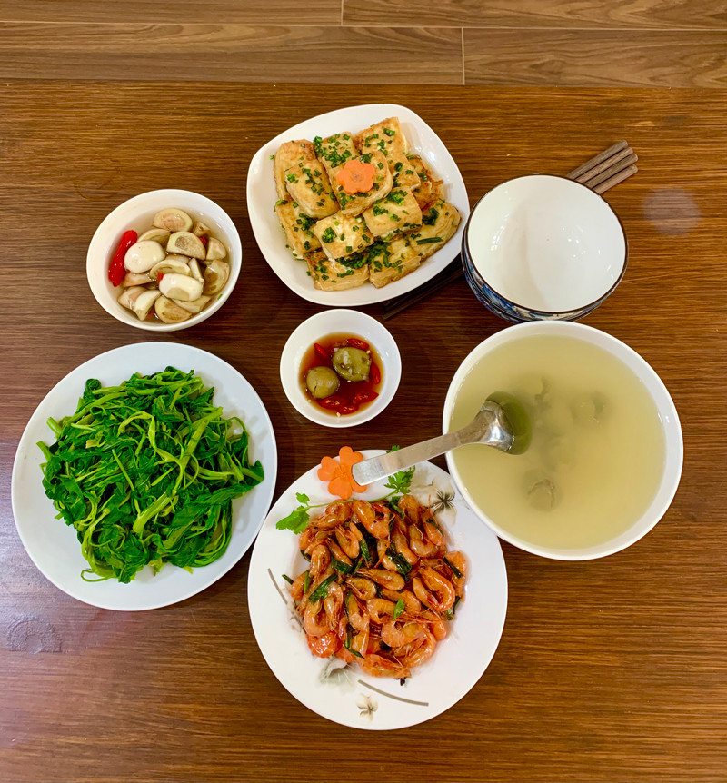 Bà kể tiếp: “Tôi nhớ những bữa cơm gia đình ngồi quây quần cả bà, bố mẹ, 5 anh trai và tôi. Mỗi lần vắng ai, mẹ tôi đều xẻ ra đĩa để phần. Ai bận không về, thức ăn đó lại bày ra mâm. Mâm cơm ngày xưa chủ yếu có đậu phụ tẩm hành, rau muống, lạc rang, trứng… Gia đình nào có điều kiện sẽ bày biện thêm món thịt kho, cá kho, rươi…”.