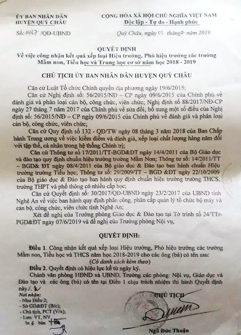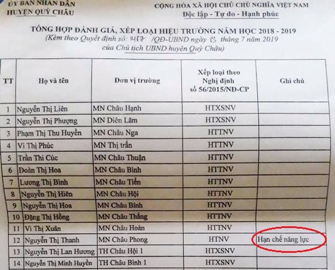 Tuy nhiên, tại Quyết định số 1467/QĐ-UBND ngày 3/7/2019 của UBND huyện Quỳ Châu về việc công nhận kết quả xếp loại Hiệu trưởng, Phó Hiệu trưởng các trường học trên địa bàn năm học 2018-2019 thì cô Thanh được xếp loại “Hoàn thành nhiệm vụ”, và được ghi chú “Hạn chế năng lực”.
