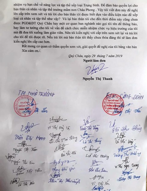 Theo tìm hiểu của PV, trước đó cô Nguyễn Thị Thanh có làm đơn kiến nghị về việc xếp loại không hợp lý đối với kết quả thi đua của bản thân và Trường Mầm non Châu Phong trong năm học 2018 - 2019.