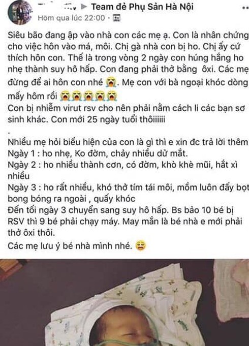 Trên facebook nhiều thông tin chia sẻ về virus RSV có thể gây tử vong cho trẻ và đang có dịch. Những nội dung như “các mẹ đang nuôi con nhỏ, đặc biệt là trẻ sơ sinh, ở thời điểm giao mùa này nguy cơ lây nhiễm các bệnh về đường hô hấp rất cao, nên hạn chế cho con đến những nơi công cộng, nơi đông người, tránh khói thuốc lá, khói than củi, khói bụi, và đặc biệt là KHÔNG CHO BẤT CỨ AI HÔN CON CỦA MÌNH.