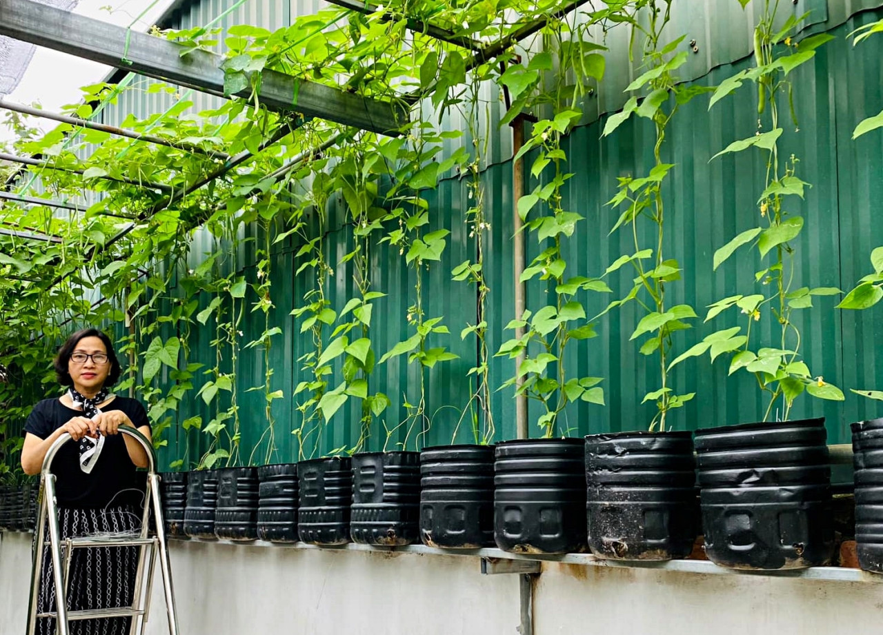 Trời chiều tắt nắng, chị Phạm Lan Anh (55 tuổi, huyện Văn Giang, Hưng yên) cùng 2 cháu ngoại ra sân nhà chăm sóc khu vườn đủ mọi loại rau, hoa, trái. Khu vườn được chị Lan Anh tự tay trồng từ vô số vật dụng tái chế, rác thải vào năm 2019.