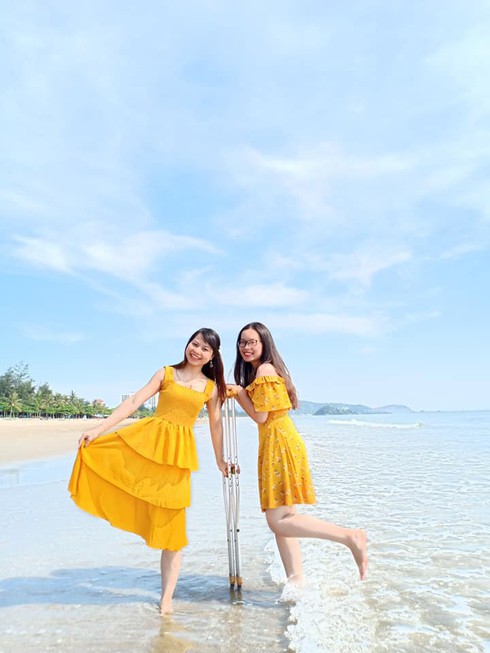 Thu vui vẻ bên người bạn của mình trong một lần đi biển. |