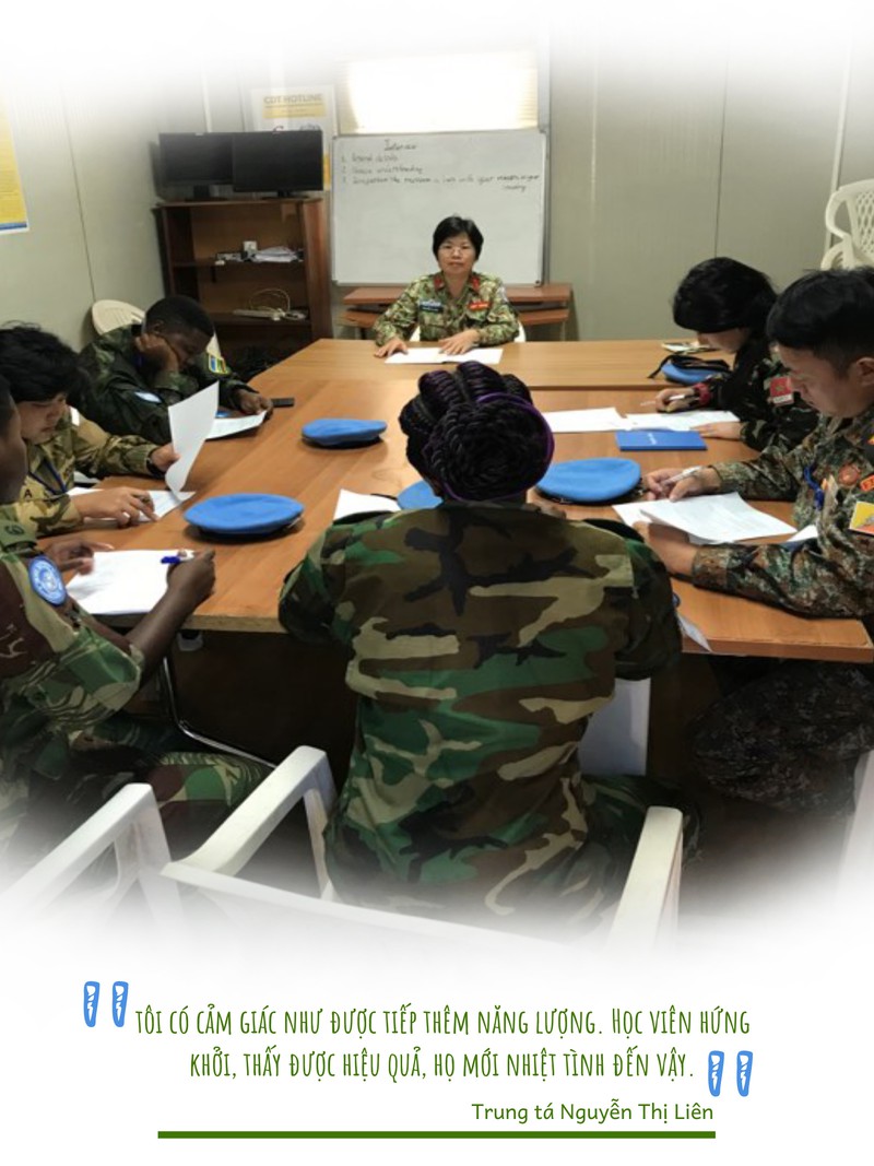 Chị Liên bắt đầu nhiệm kỳ 1 năm của mình tại CH Trung Phi từ tháng 6/2019 với nhiệm vụ của một sĩ quan tham mưu đào tạo tại Phái bộ Giữ gìn hòa bình của Liên Hợp Quốc. Hàng ngày, Trung tá Liên cũng phải lên lớp, nhưng khác với ở nhà, học viên bên này là người nước ngoài, đặc biệt có những học viên được coi là “leader – lãnh đạo”, thậm chí cả tướng, cũng phải qua lớp đào tạo, vì thế đòi hỏi chị phải chuẩn bị rất kỹ càng. Chị Liên còn nhớ có một buổi lên lớp, sau khi chị kết thúc bài giảng, vị học viên đeo hàm tướng ở Phái bộ, bất ngờ đứng lên tiếp tục bổ sung thêm thông tin cho bài giảng của chị.