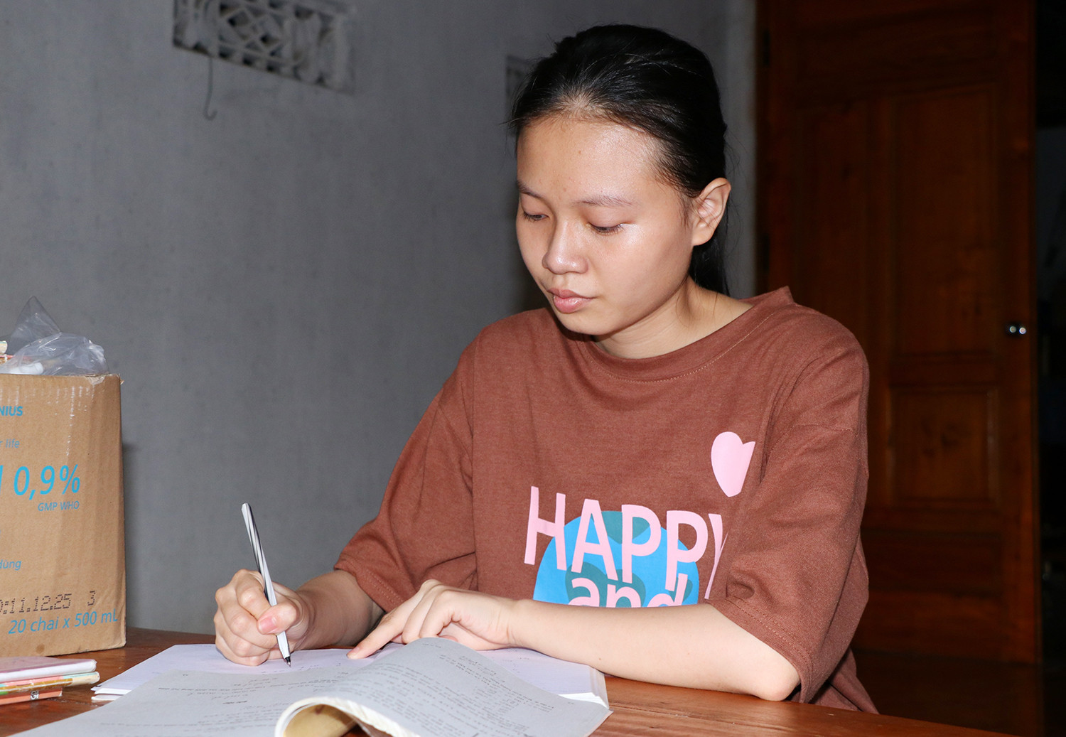 “Lớp 12, em đi học đầy đủ, tham gia các buổi ôn thi ở trường. Buổi tối tranh thủ lúc bố mẹ ngủ, em học bài. Dù là con nuôi nhưng em luôn cảm thấy mình may mắn khi được làm con của bố mẹ.