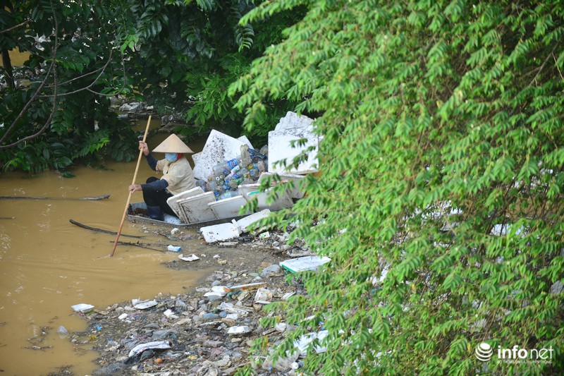 Nhiều người phải dùng thuyền tôn chèo ra giữa làn nước để vớt từng loại rác thải nhựa để bán ve chai. |