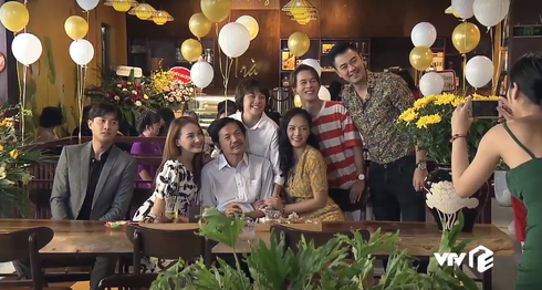 Đại gia đình ông Sơn cùng Quốc và Vũ trong ngày lễ khai trương tiệm bánh trà của Huệ. Những nụ cười sau bao ngày đẫm nước mắt của các nhân vật. |