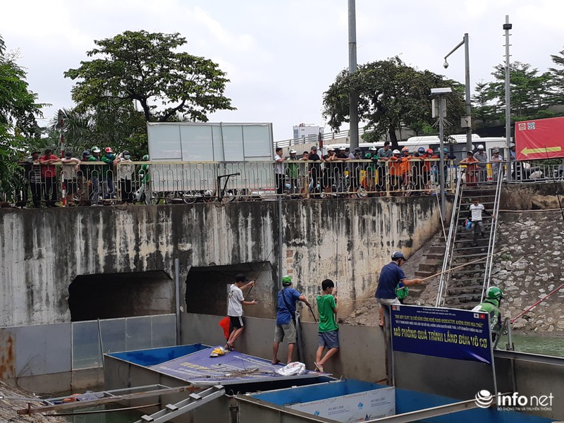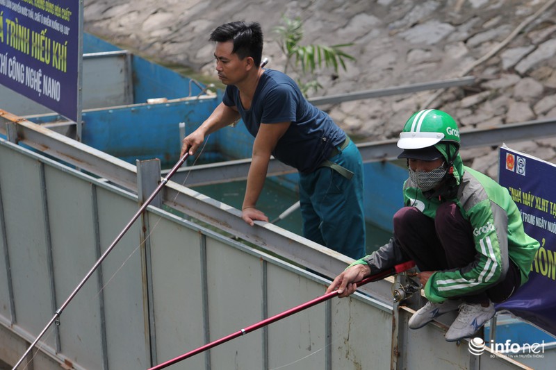 Theo ghi nhận của PV Infonet, chiều ngày 2/9 có khoảng hơn 20 cần thủ có mặt ở đoạn đầu sông Tô Lịch, thả cần câu cá.