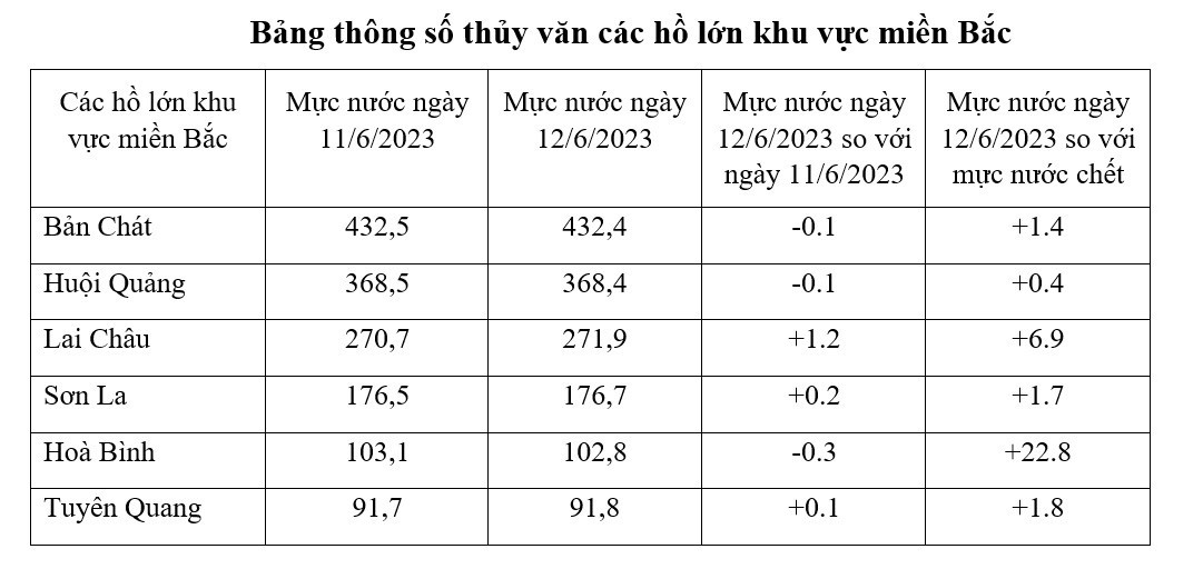 Tổng lưu lượng nước về các hồ thủy điện lớn miền Bắc tăng 28% so với lưu lượng nước về ngày 11/6, chủ yếu về các hồ Hòa Bình và Lai Châu.