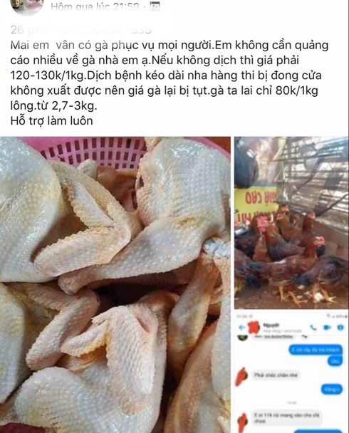 Tương tự, chị Thu (Bắc Từ Liêm, Hà Nội) cũng rao bán gà “giải cứu” trên chợ online, chị này đăng: “Nhà bác mình ở dưới quê có nuôi được đàn gà ta lai, cho ăn thóc nên thịt gà rất chắc. Do dịch Covid-19, gà khó bán nên nhờ mình đăng lên chợ mạng để bán hộ, được ít nào thì bù vào tiền thóc ngô. Mỗi con gà nặng tầm 2,5-3kg (cả lông), giá 80.000 đồng/kg và được làm sạch miễn phí”.