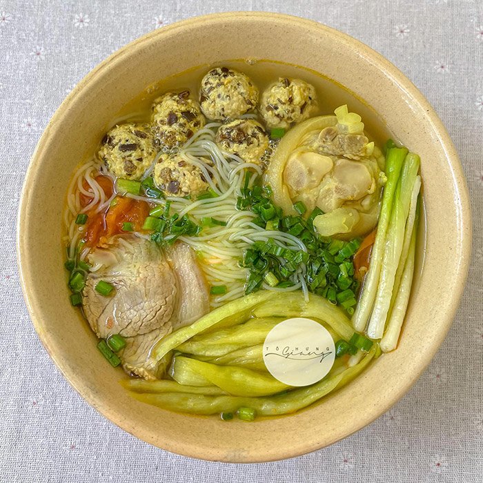 - Khi ăn xếp bún ra bát to, xếp thịt chân giò, móng giò, mọc, dọc mùng, một miếng cà chua, chan nước dùng thật nóng, rắc hành mùi lên trên.