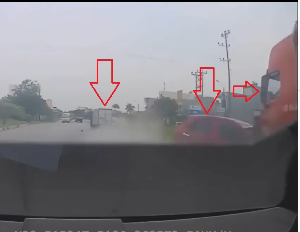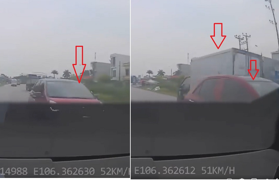 Thế nhưng do thiếu quan sát, vượt ẩu nên khi vừa lấn sang làn đường ngược chiều ô tô màu đỏ đã đâm ngay vào chiếc xe tải rồi mất lái. Ngay sau đó một chiếc xe container đi tới lại đâm trực diện chiếc xe ô tô màu đỏ này.