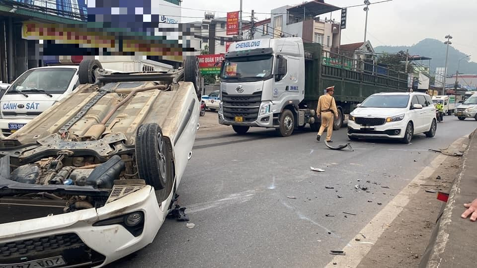 Cao tốc Thái Nguyên - Bắc Kạn: Xe ô tô sang đường ẩu, lật ngửa bụng giữa đường sau va chạm